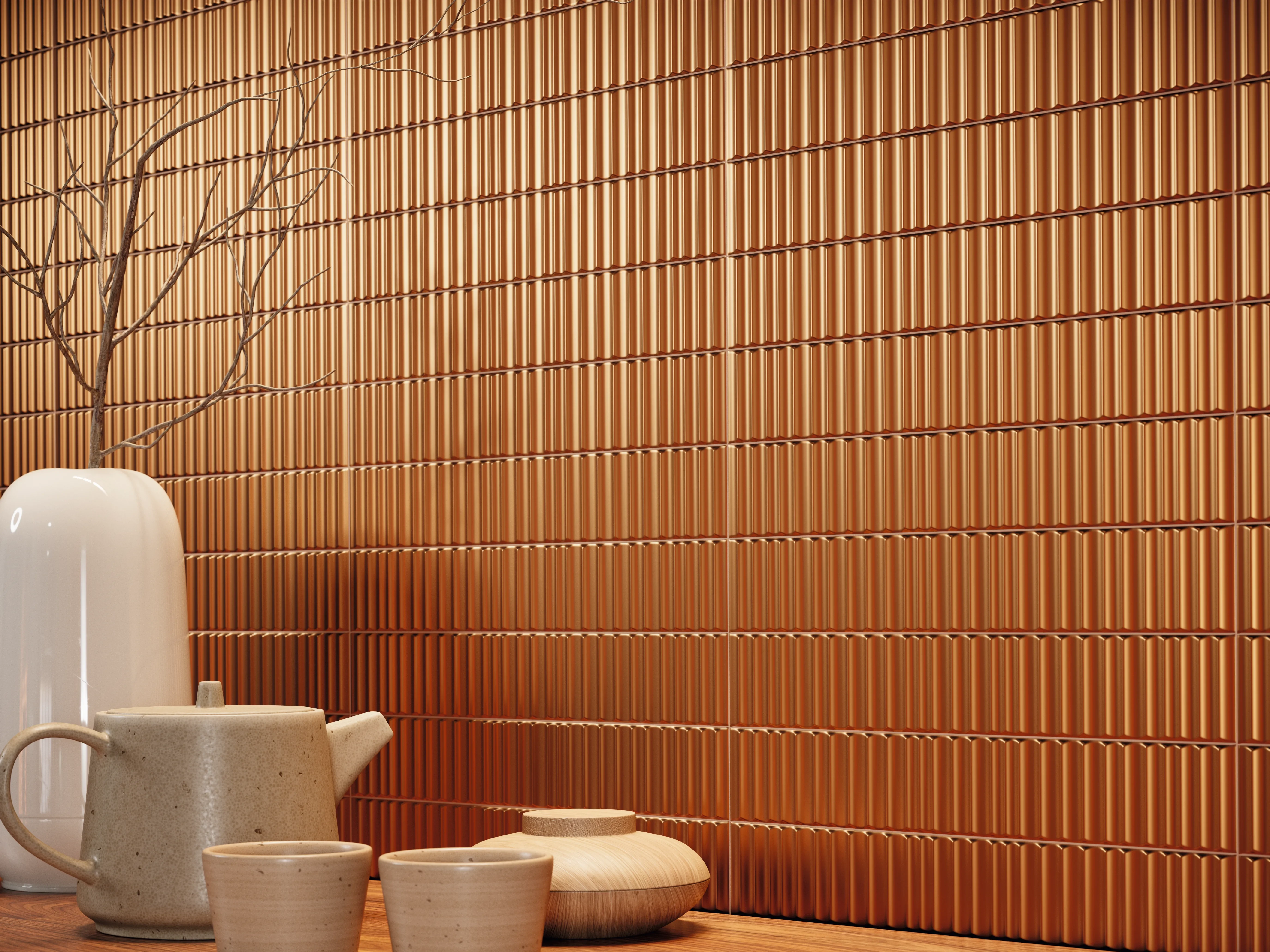 Głównym atutem ceramiki Metallica Copper jest jej wyrazista, prążkowana rzeźba. Regularne, podłużne żłobienia nadają kafelkom trójwymiarowy charakter. Powłoka o wysokim połysku sprawia, że światło wędruje po wypukłościach, tworząc wibrujące, świetlne widowisko na całej wyłożonej płaszczyźnie. Śliskie, szkliwione lico nie tylko potęguje wrażenia estetyczne, ale jest również niezwykle łatwe w utrzymaniu – chroni ścianę przed wnikaniem brudu i pozwala na szybkie zmycie codziennych zabrudzeń.